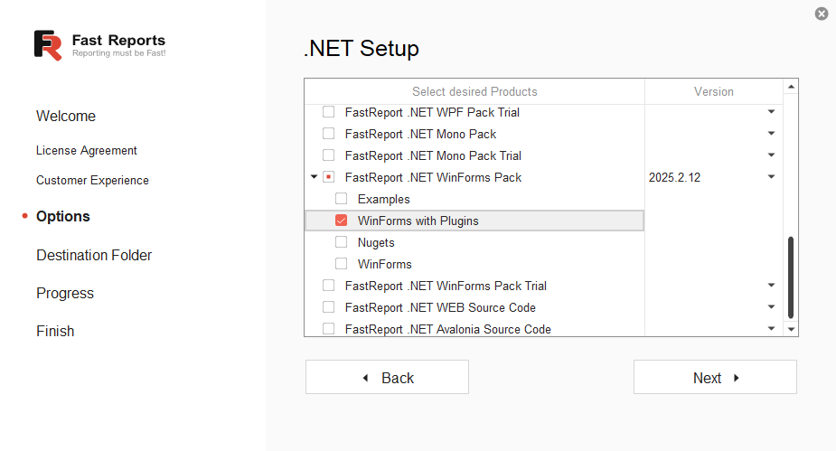 When installing FastReport .NET WinForms, at the “.NET Setup” stage, you can select the “WinForms” and “WinForms with Plugins” options.