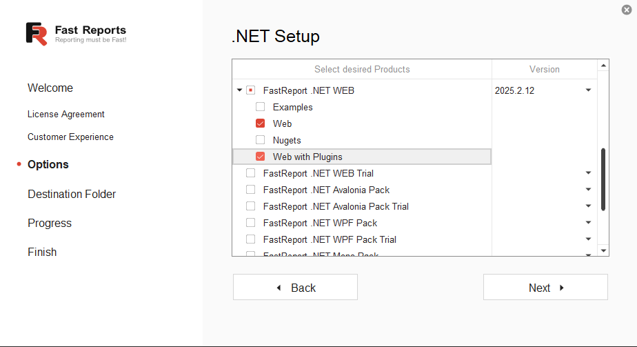 Similarly, when installing FastReport .NET WEB, you can select the “Web” and “Web with Plugins” options.