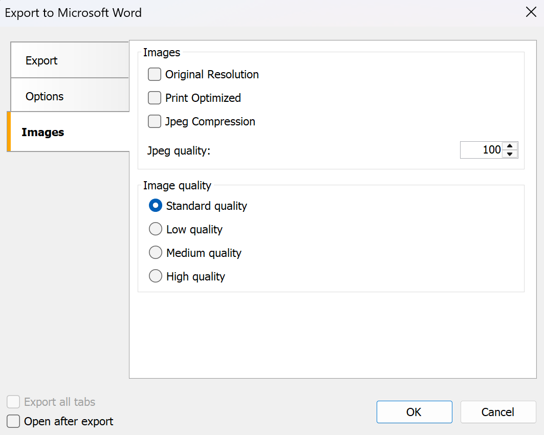 Previously, exporting to Word saved images in fixed quality, which was not always convenient. In the latest version of FastReport .NET, we have added new image export functions. Now you can independently adjust the balance between the quality and size of the final document.