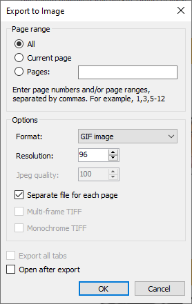 using FastReport; using FastReport.Export.Image; ... private void Form1_Load(object sender, EventArgs e) { ImageExport imageExport = new ImageExport(); Report report = new Report(); report.Load(“Simple List.frx”); report.Prepare(); //Selecting the format of the image to be saved imageExport.ImageFormat=ImageExportFormat.Tiff; //Resolution of the resulting image imageExport.Resolution = 96; //Jpeg file quality imageExport.JpegQuality = 100; //If the export generates several images, then when the TIFF format is selected //a multi-page single file will be generated imageExport.MultiFrameTiff = true; //Monochrome image when selecting the TIFF format imageExport.MonochromeTiff = false; report.Export(imageExport, “img.tiff”); }