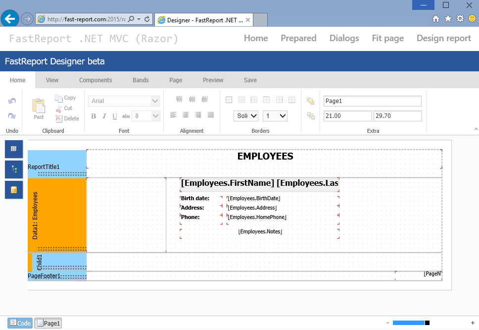 In FastReport .NET 2015.1 we have released an Online Report Designer. This Designer can be used directly in the user's browser and allows to edit the appearance of a report template, modify the properties of objects, and edit the script and events.
