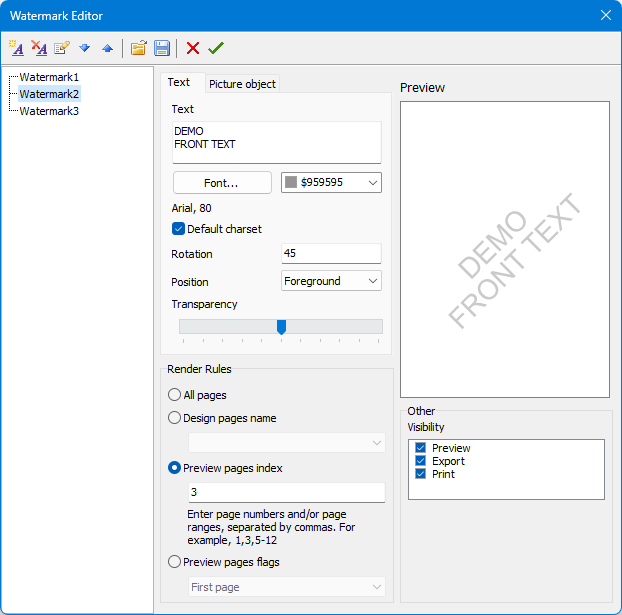 TfrxWatermark class stores data for displaying a watermark and has the following properties, which can be edited using the watermark editing form.