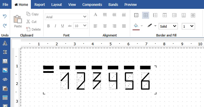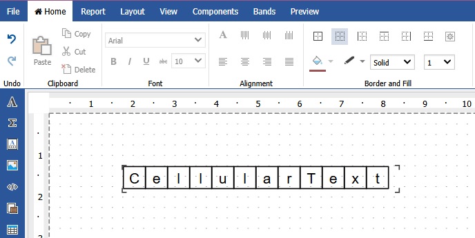 Für die Textanzeige in Zellen wurde die Cellular Text Komponente implementiert. Sie platziert jedes Textzeichen in einer separaten Zelle und eignet sich daher ideal für die Anzeige von Daten, die ein Zeichen pro Zelle erfordern (z. B. Seriennummern, Codes, Dokumentnummern). Die Cellular Text-Komponente unterstützt die Anpassung von Zellengröße, Rahmen und Textausrichtung innerhalb der Zellen und kann einen eingegebenen Text automatisch in einzelne Zeichen aufteilen.