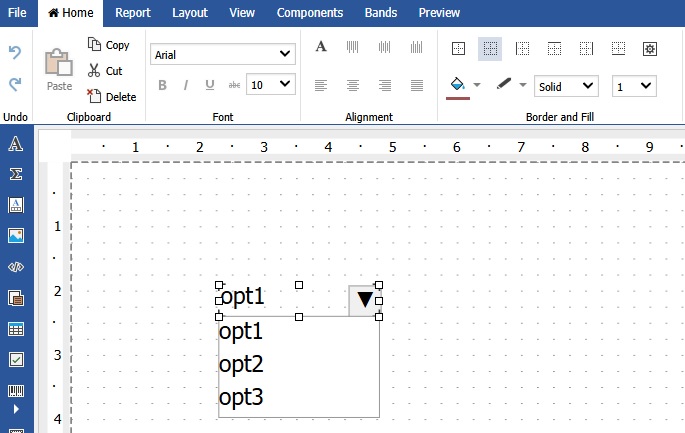 Eine neue Combobox-Komponente wurde hinzugefügt. Es geht um eine Dropdown-Liste mit vordefinierten Werten. Mit dieser Komponente kann der Benutzer eine Option aus einer vordefinierten Liste auswählen. Diese Funktion hilft Ihnen bei der Erstellung interaktiver Berichte und Dialogformulare, in denen die Auswahl des Benutzers auf bestimmte Werte beschränkt werden soll. Die Combobox unterstützt die Anpassung der Liste der Elemente und kann mit Datenquellen verknüpft werden, um die Werteliste dynamisch auszufüllen.