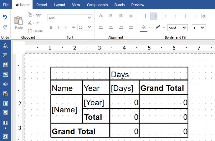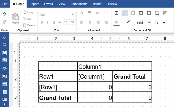 Die hinzugefügte Cross-Tab-Komponente stellt ein leistungsstarkes Werkzeug zum Erstellen von Kreuztabellen und Pivot-Berichten ohne direkte Verbindung zu Datenquellen dar. Die Cross-Tab-Komponente arbeitet mit Daten, die bereits über andere Komponenten (z. B. DataBand) in einen Bericht geladen wurden. Sie ermöglicht es Ihnen, diese Daten gleichzeitig nach mehreren Dimensionen zu gruppieren und eine Matrixdarstellung der Informationen mit automatischen Summen zu erstellen. Die Komponente unterstützt die Anpassung von Zeilen und Spalten, die Anwendung verschiedener Aggregatfunktionen (Summe, Durchschnitt, Anzahl), die Zellformatierung und die Erstellung mehrstufiger Gruppierungen.