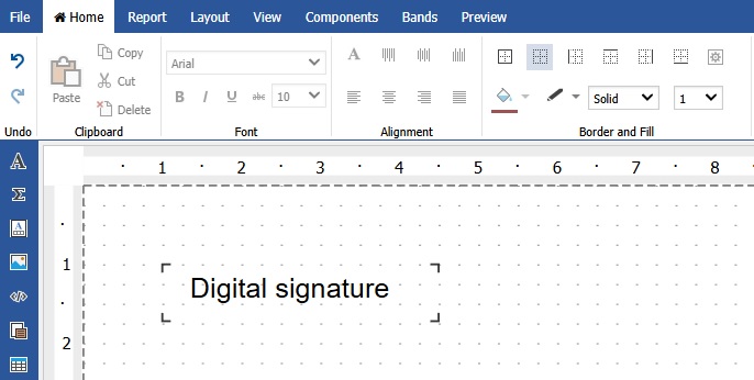 Die Digital Signature-Komponente wurde hinzugefügt, um die Verwendung digitaler Signaturen in Berichten zu ermöglichen. Mit dieser Komponente können Sie Speicherorte für digitale Signaturen hinzufügen, die während der Berichtserstellung konfiguriert werden können.