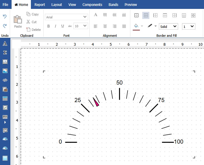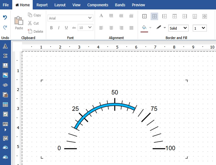 Es wurde die Gauge-Komponente hinzugefügt. Es geht um einen Geber zur Visualisierung numerischer Werte als Skala oder Fortschrittsanzeige. Mit der Gauge-Komponente lassen sich Kennzahlen, KPIs und andere Indikatoren in Berichten visuell darstellen und so verständlicher und ansprechender gestalten. Die Komponente unterstützt verschiedene Darstellungsstile (kreisförmig, linear), anpassbare Wertebereiche, Farbzonen zur Kennzeichnung kritischer Werte und kann mit Datenquellen für die dynamische Anzeige von Indikatoren verknüpft werden.