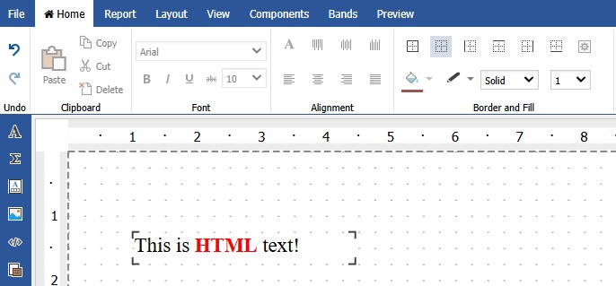 Die implementierte HTML Object-Komponente dient zur Anzeige der HTML-Inhalte direkt in Berichten. Dies eröffnet vielfältige Möglichkeiten zur Textformatierung mit HTML-Markup sowie zum Einbetten von Tabellen, Listen und anderen formatierten Inhalten.Die Komponente verarbeitet HTML-Tags korrekt, wendet Stile an und ermöglicht die Erstellung komplexer strukturierter Inhalte innerhalb eines Berichts mithilfe der gewohnten HTML-Syntax.