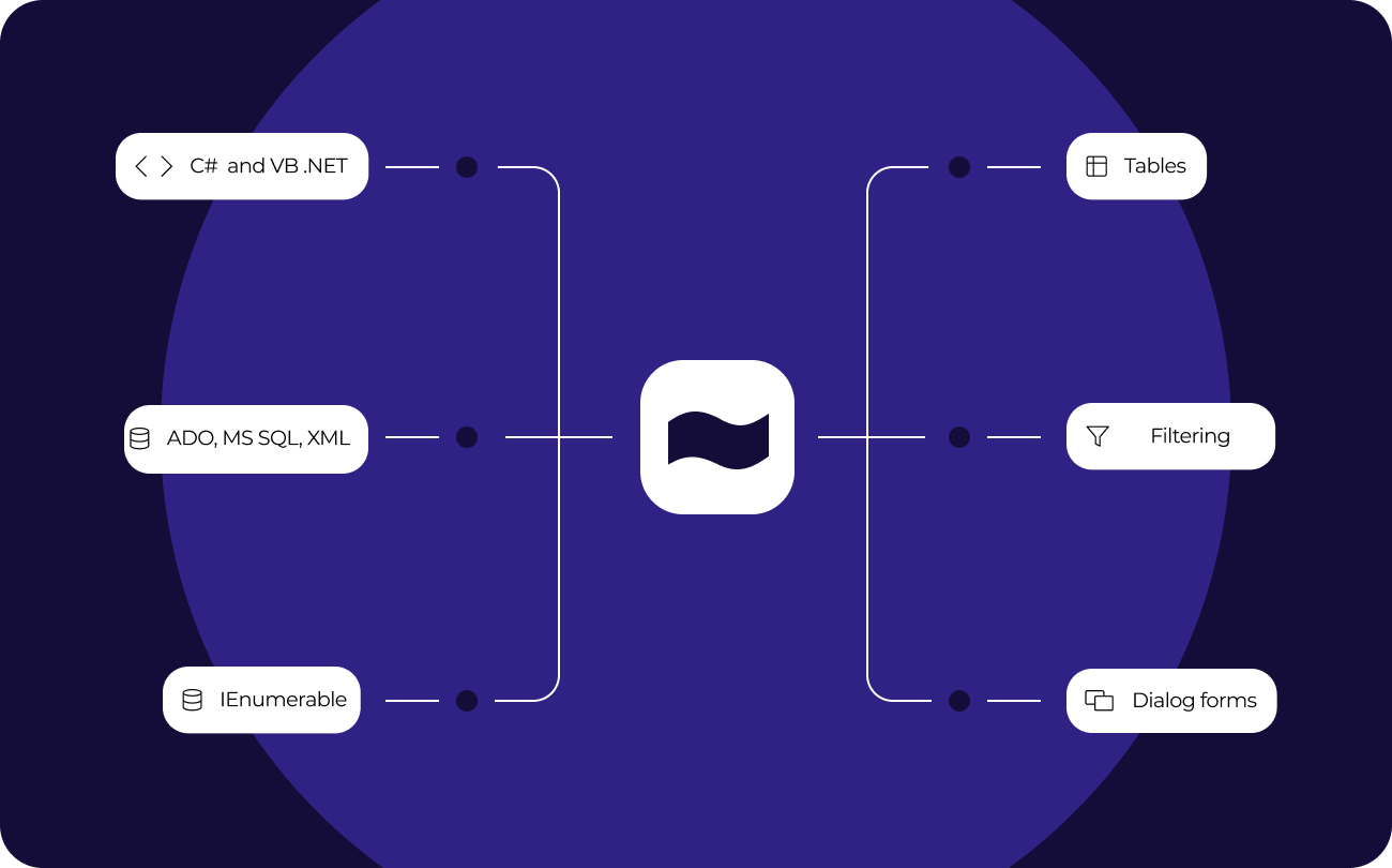 FastReport .NET WinForms arbeitet mit ADO .NET-Datenquellen. Es unterstützt das Sortieren und Filtern von Daten sowie Master-Detail-Beziehungen. Alles kann mit wenigen Klicks konfiguriert werden. Es ist möglich, eine Verbindung zu ADO-, MS SQL- und XML-Datenbanken herzustellen. Konnektoren sind für die Verbindung mit anderen Datenbanktypen verfügbar, und Sie können auch Daten von Geschäftsobjekten des Typs IEnumerable abrufen.