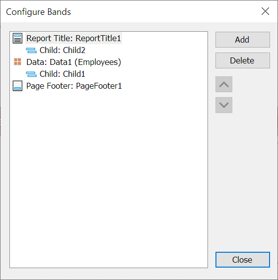 Our reports can have multiple band types, each with a different purpose. For example, the report title is always at the top of the report. Another example is the page footer, which is located at the bottom of every page. The relative positions of these bands cannot be changed.