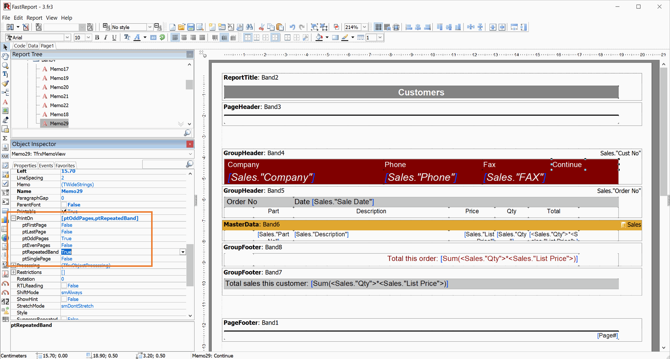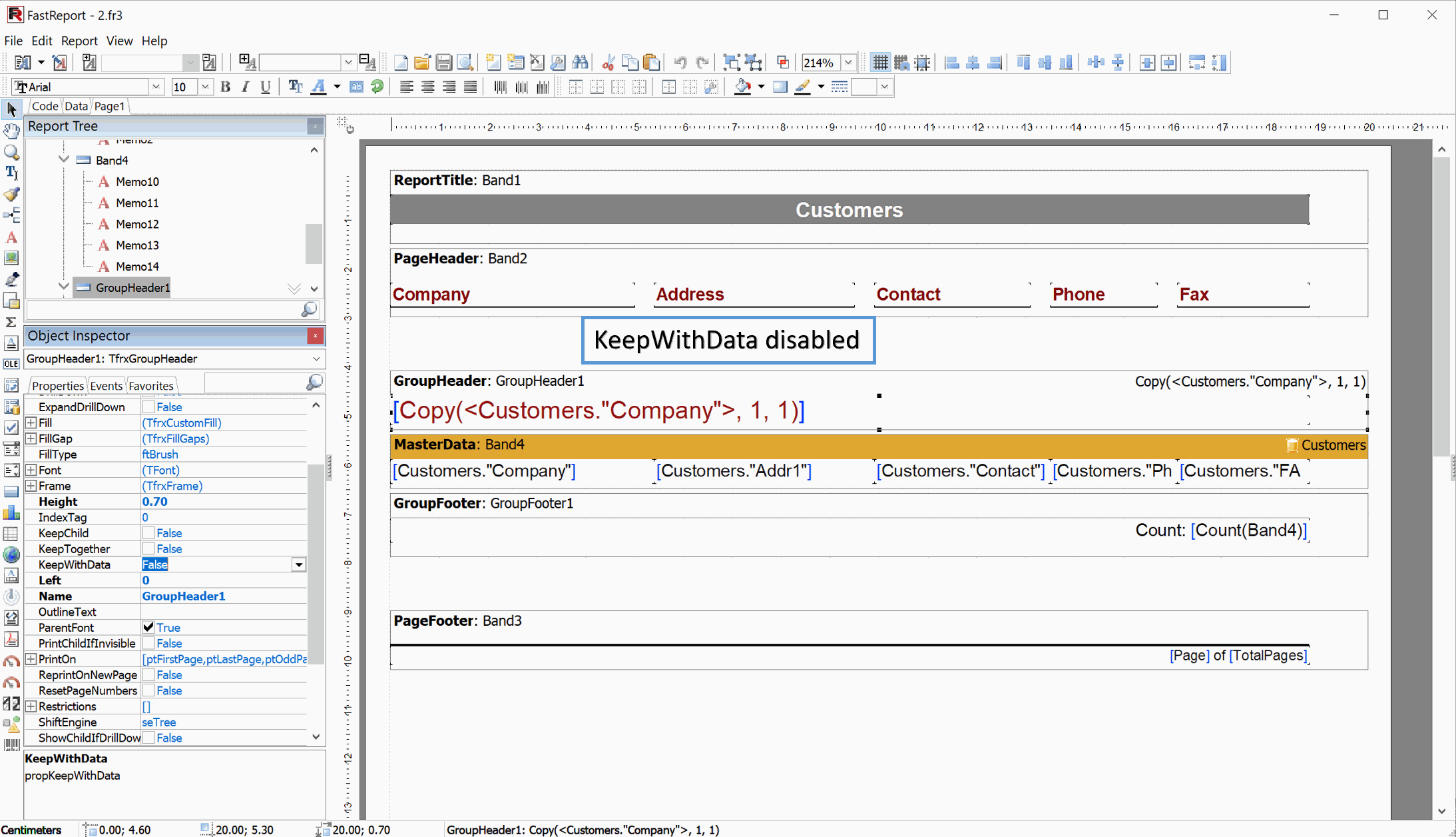 Managing report bands is now easier. Group headers and footers have a new property: KeepWithData. It specifies that a group header or footer should remain together with the data record when moving to a new page. This property is similar to KeepHeader and KeepFooter, but works with group bands.