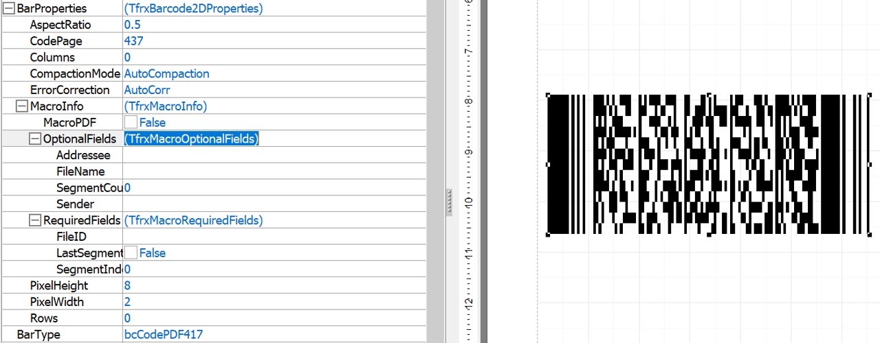 Support for Macro PDF417 has been added. A comprehensive set of properties has been introduced to the standard PDF417 object, allowing for detailed configuration in accordance with the standard’s requirements.
