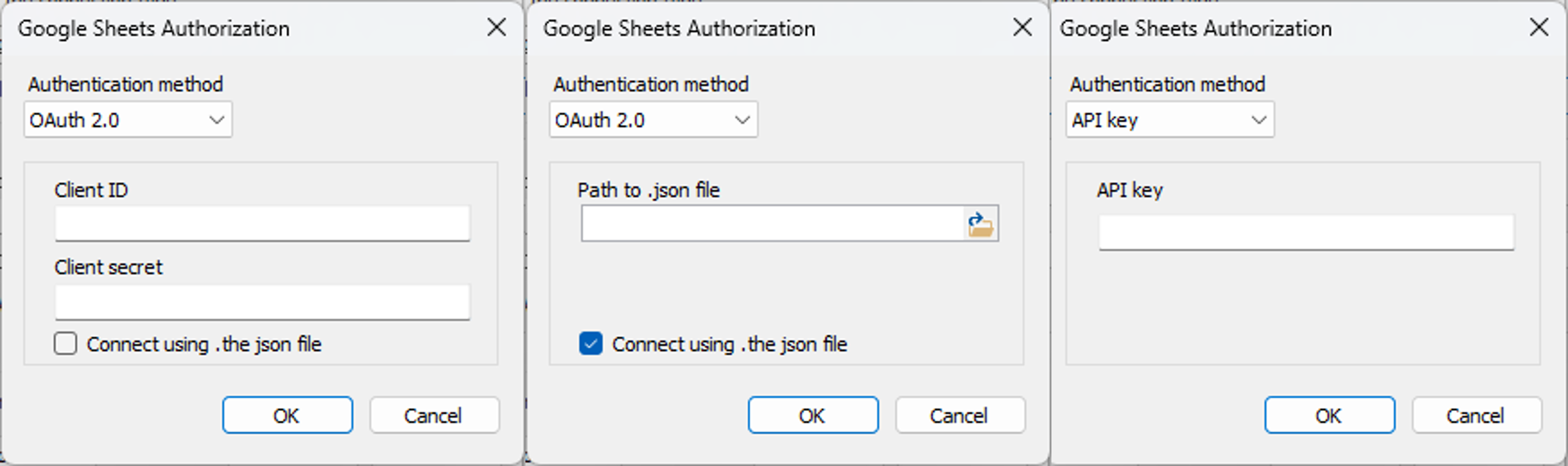 Para começar a usar o Google Planilhas, você precisa preparar suas credenciais de login. Três tipos de credenciais são aceitos: