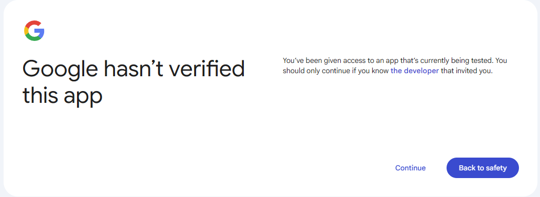 A próxima etapa exibirá um aviso de que o aplicativo não passou na análise do Google. Esta é a mensagem padrão para aplicativos em modo de teste. Clique em “Continuar” para conceder acesso.