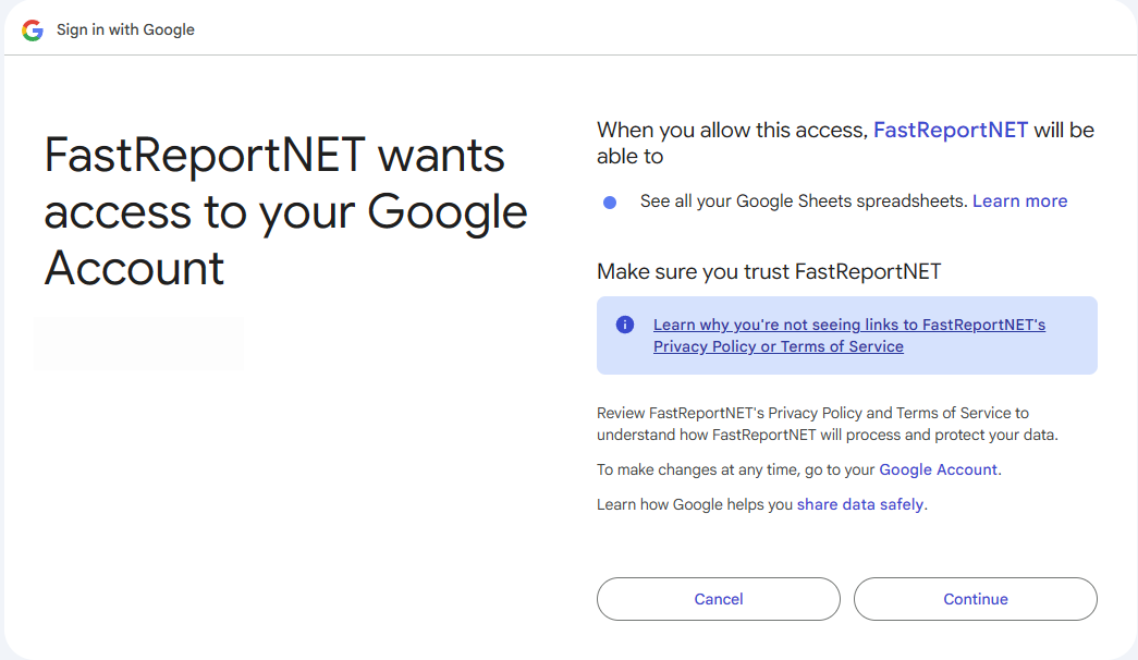 Uma tela de solicitação de permissões será exibida, indicando que o aplicativo de nome “FastReportNET” precisa de permissão para visualizar todas as planilhas do Google Planilhas. Revise as permissões solicitadas e clique em “Continuar” para confirmar.
