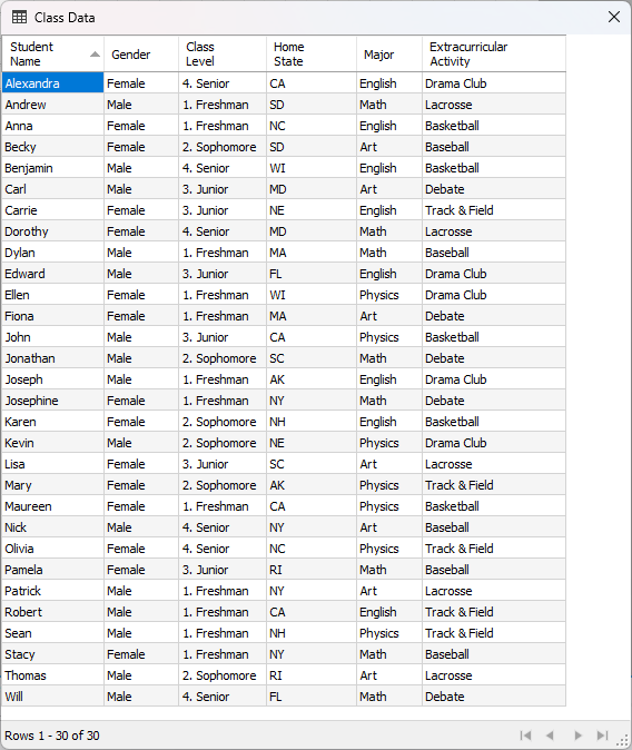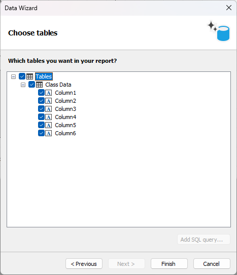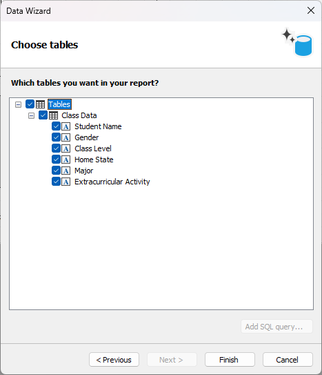 Retorne ao Designer do FastReport .NET. Se a conexão for bem-sucedida, a próxima janela exibirá uma lista de tabelas do Google Planilhas disponíveis para seleção. As capturas de tela abaixo mostram como a lista de campos muda dependendo da opção “Cabeçalhos de coluna da primeira linha”: