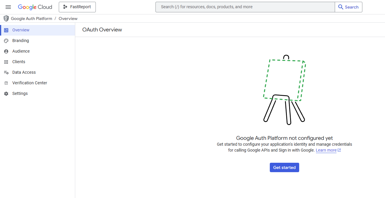 Nesta etapa, configuraremos o OAuth para o nosso aplicativo. Depois de clicar em “Get started”, o assistente de configuração da Plataforma do Google Auth será aberto.