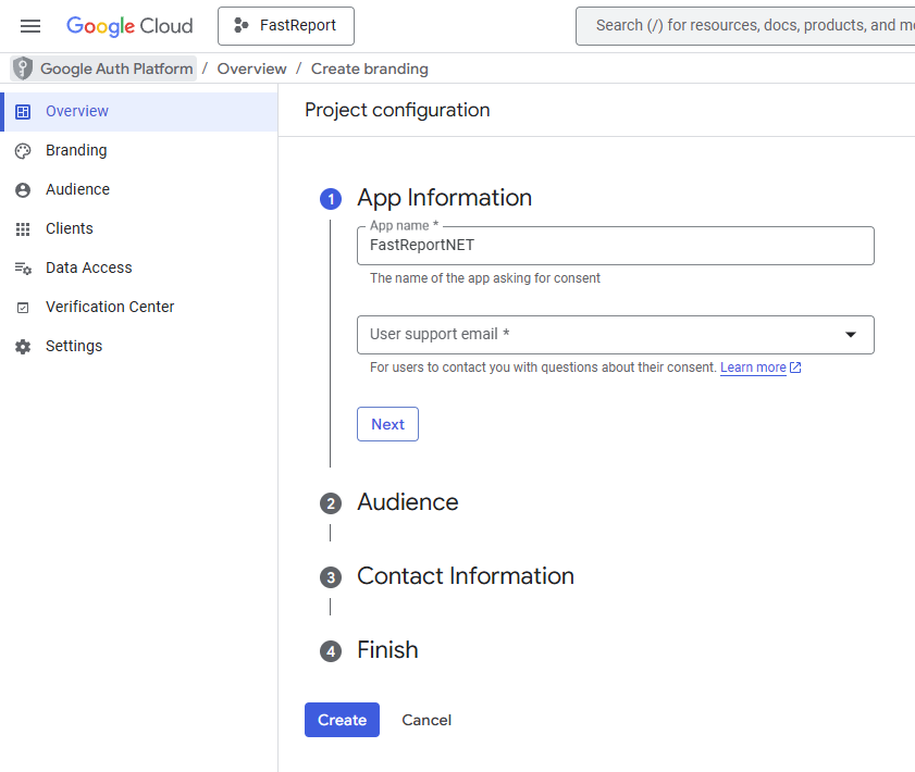 Na primeira etapa, preencha as informações do aplicativo: insira um nome (por exemplo, “FastReportNET”) e um endereço de e-mail de suporte ao usuário e clique em “Next”.