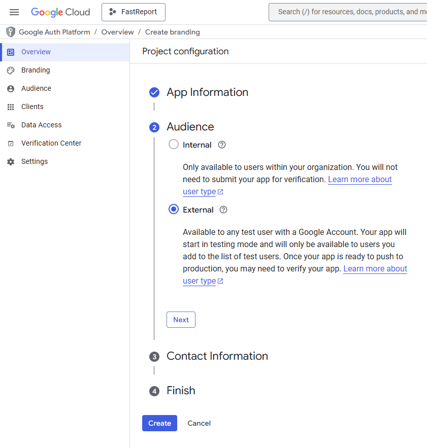 Você pode obter esses dados por meio do Google Cloud Console. Após fazer login, crie um novo projeto no console: no painel superior, clique na lista suspensa de projetos (“Select a project”), selecione ‘Newproject’ na janela que se abre, dê um nome ao projeto (por exemplo, “FastReport”) e clique em “Create”. Assim que criado, o projeto será ativado automaticamente. Caso contrário, selecione-o manualmente na lista de projetos.