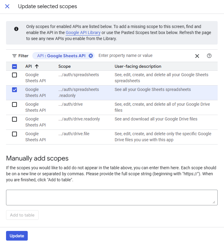 Clique no botão “Add or remove scopes” para abrir a lista de permissões disponíveis. No campo de filtro, digite “API:GoogleSheetsAPI” e selecione a opção com a descrição "SeeallyourGoogleSheetsspreadSheets" (acesso somente leitura). Essa opção é suficiente para gerar relatórios e é mais segura: o aplicativo não poderá modificar ou excluir dados das planilhas. Marque a caixa da permissão selecionada, clique em “Update” e, em seguida, em “Save”.