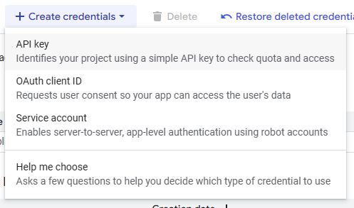 O sistema oferecerá três opções para criar credenciais, mas duas são as mais adequadas para nossos propósitos: API Key e OAuth Client ID. Discutiremos cada opção com mais detalhes abaixo. A terceira opção disponível, Service Account, não será abordada, pois destina-se a aplicativos de servidor e processos automatizados sem intervenção do usuário.