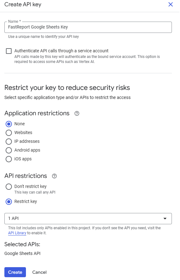 Na seção “APIrestrictions”, selecione “Restrictkey” (restringir chave) – esta é uma configuração de segurança importante. Após selecioná-la, uma lista de APIs disponíveis será exibida. Encontre e selecione “GoogleSheetsAPI”. Isso impedirá o uso não autorizado da chave para acessar outros serviços do Google.