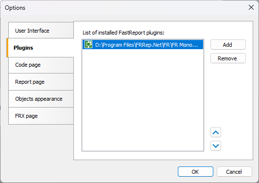Após compilar o projeto, conecte o plugin ao FastReport. Para utilizá-lo no designer de relatórios, adicionamos o arquivo DLL compilado por meio do menu de configurações: