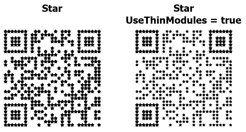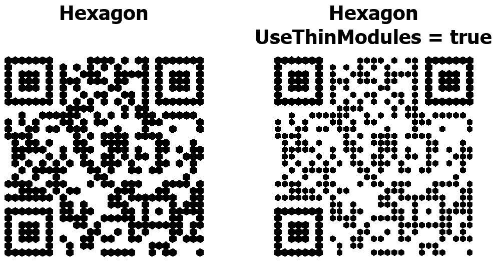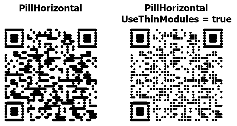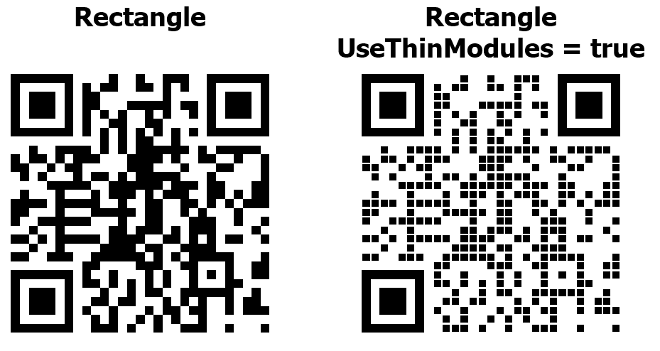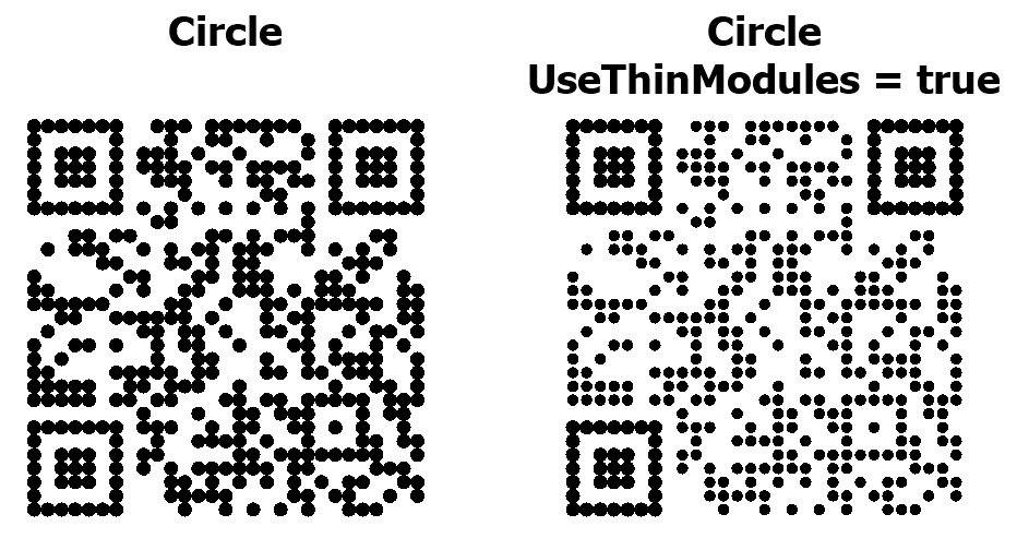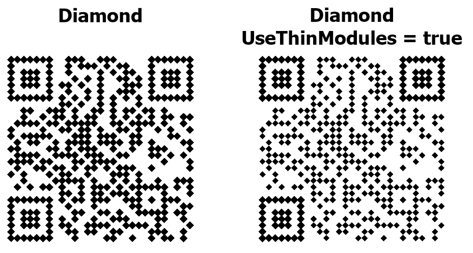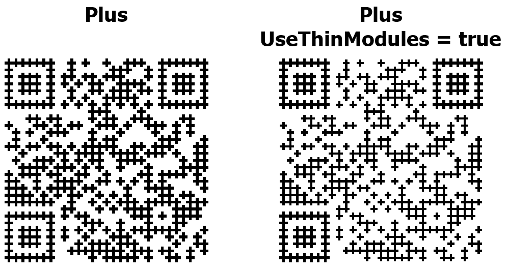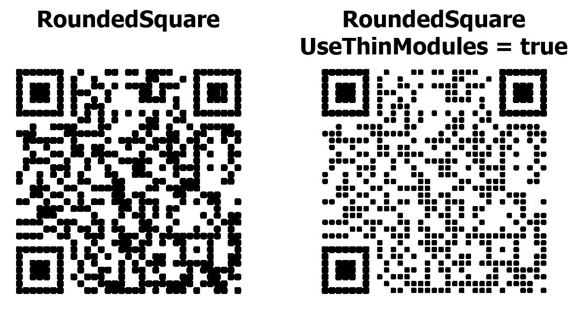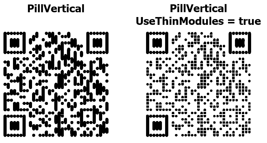 Propriedade UseThinModules controla a densidade visual dos módulos (pontos) no QR code. Quando UseThinModules = false (por padrão), os módulos ocupam todo o espaço disponível em sua célula — os pontos se tocam sem deixar espaços, e o QR code parece sólido e denso. Quando UseThinModules = true o tamanho dos módulos é reduzido e aparecem espaços visíveis entre eles, que cria efeito de “grade” ou “padrão de pontos”.