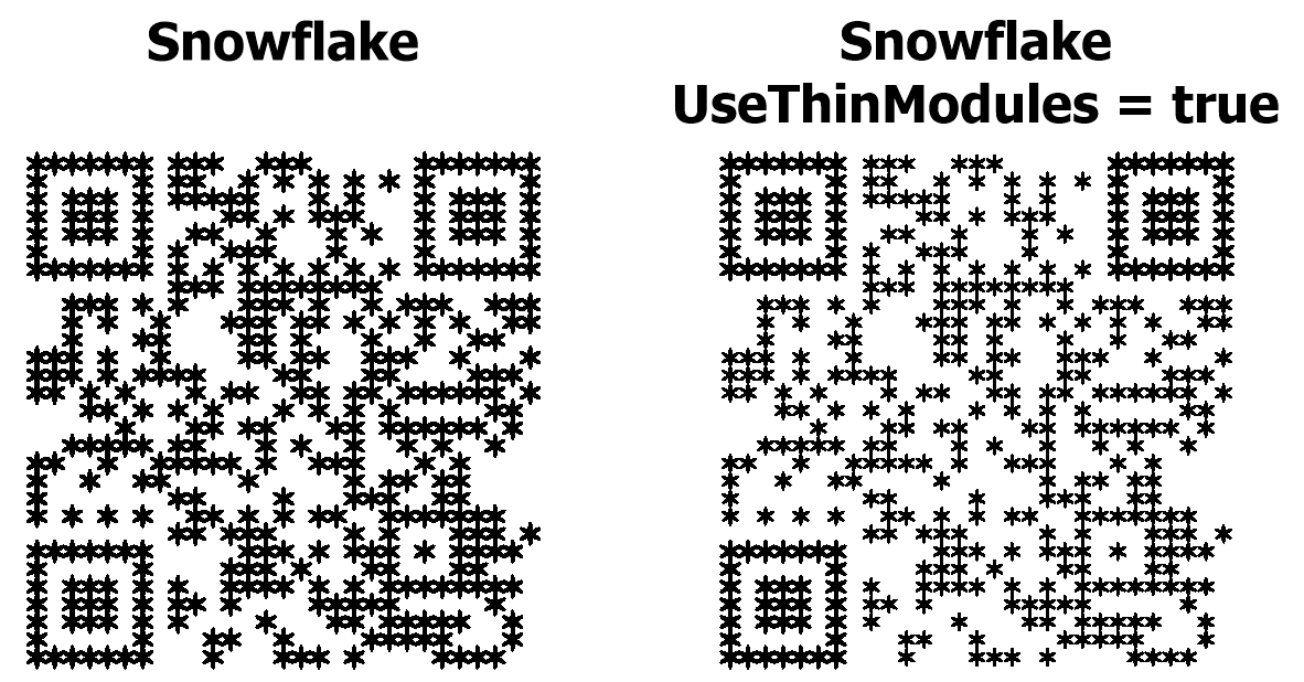 As figuras Snowflake e Star têm geometria complexa com pequenos detalhes. Quando o tamanho é pequeno, esses detalhes se misturam e o scanner não consegue reconhecer os módulos corretamente. Use Snowflake e Star para códigos grandes. Para códigos pequenos, escolha Square, Circle ou RoundedSquare. Use a propriedade UseThinModules com cuidado – os espaços entre os módulos podem prejudicar a leitura em tamanhos pequenos.