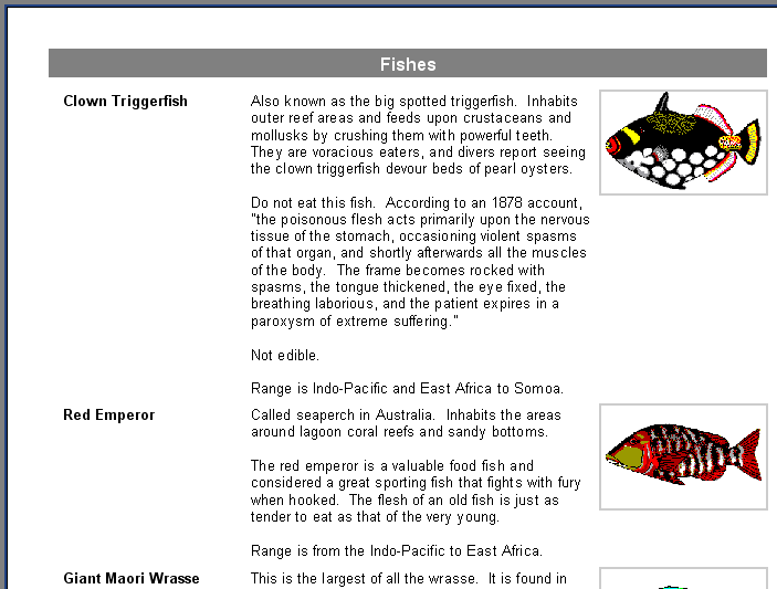 Of course, either the size of the object could be increased or its font size could be reduced. However, this may lead to wastage of space on the output page as some fish have long descriptions, while others have short ones. FastReport has some properties which allow us to resolve this problem.