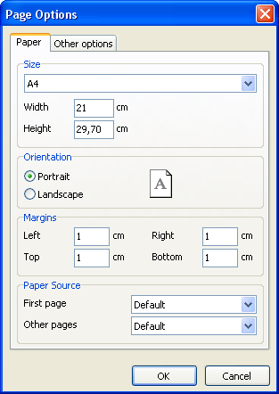 The “Page Options” are available via either the “File>Page settings...” menu or by double-clicking on blank space on the page. The dialogue has two pages: