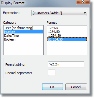 This editor lists the format categories on the left, the corresponding formats on the right and the format string and decimal separator for the selected category and format below.