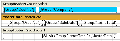 SUMis linked to the “MasterData1” band). - During report output (when the data band is displayed) the values of the aggregates linked to it are calculated. In our case the Group.“ItemsTotal” field values are accumulated.