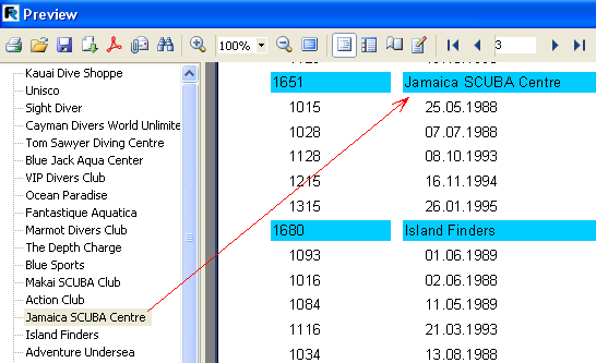Set the value of the GroupHeader1.OutlineText band property to <Group."Company">. To make the tree visible as soon as the preview window opens set the PreviewOptions.OutlineVisible property of the “Report” object to True. On previewing the report you will now see the following: