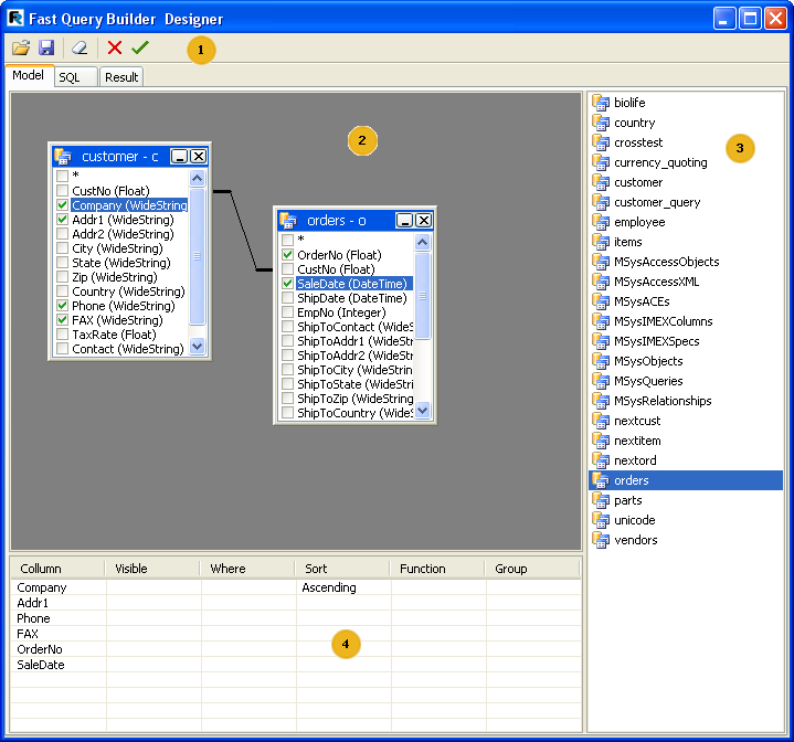 FastQueryBuilder can be used to compose queries visually. FastQueryBuilder is included in FastReport Professional and Enterprise editions, or alternatively it can be purchased as an independent product. The query builder builds queries visually in the SQL language. The builder is illustrated below: