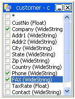 The builder's workspace and the list of available tables support drag&drop, i.e. tables can be dragged onto the workspace with the mouse. Alternatively double-click on a table in the list of available tables.