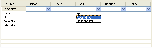 Visible: whether field appears in the outputWhere: field selection condition, e.g. '> 5'Sort: sorting direction for fieldFunction: function applied to fieldGroup: grouping on the field