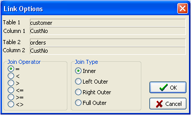 By “dragging” fields between the tables in the workspace (2) “Join lines” appear. When fields are joined the compatibility of the types of the joined fields is checked. The builder prevents joins between type-incompatible fields. To change the join parameters hold the cursor over the “join line”, right-click and select the Options item. The Link Options dialogue will open, where the join can be configured, as below: