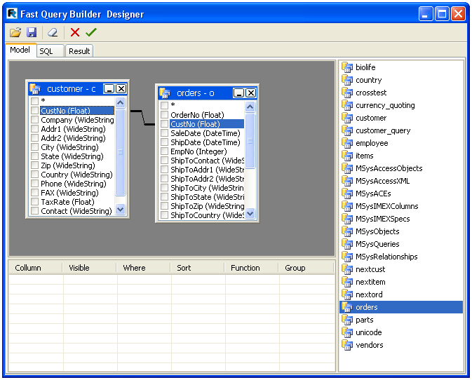 Drag two tables to the work area – Customers and Orders. Both tables have a CustNo field which we will use to join them. Drag the CustNo field from one table to the other table to create a join between the two tables: