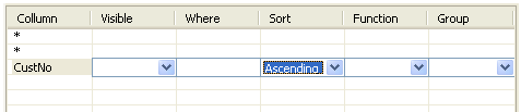 Now the fields to be displayed and the sort field need to be set. Check the "*" field in both tables and check the CustNo field in the Customer table. The selected fields appear in the field parameters list. Select the sort order for the CustNo field: