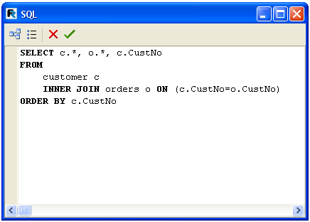 Earlier we looked at a report working with groups. Let's build a query for this report using the query builder. We need to compose a query in SQL which will return data from both tables, with the data grouped on a specific condition. In our example the condition will be CustNo fields in both tables.