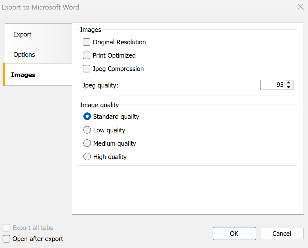 A new "Images" tab has appeared in the export settings. There, you can choose to save with the original resolution, for printing, enable compression, or select one of four qualities: standard, low, medium, or high.