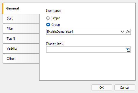 The group allows you to display a list of values grouped by condition. In the example above, the condition [MatrixDemo.Year] is specified — this means that the element will display a list of years. The list will contain non-duplicate values; identical values will be grouped.