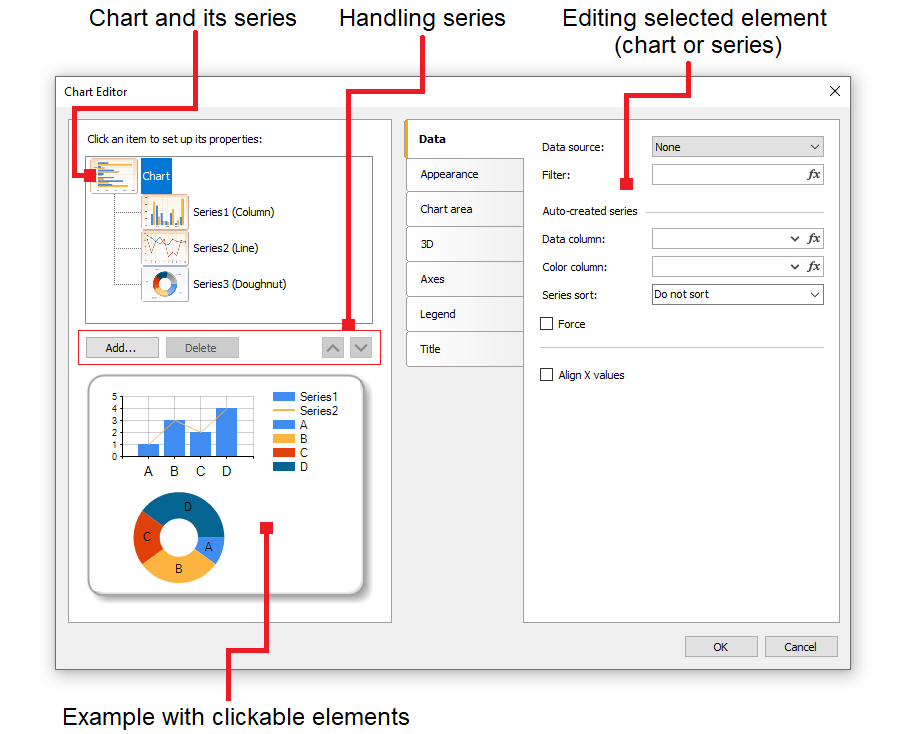 Chart editor The "Chart" object contains numerous settings which can be handled in the chart editor. To invoke the editor, double click the "Chart" object: