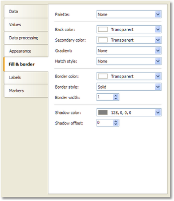 Using the chart editor, you can set up appearance of each chart element. All properties (more than 100) are splitted in several categories. Some of them are specific to "Chart" object, while others are part of series.