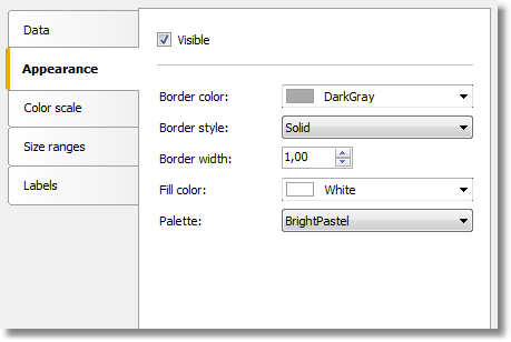 Set the border color and style of the map polygons and choose the color palette. Note that the palette is ignored if you configure the color scale (more about this later).
