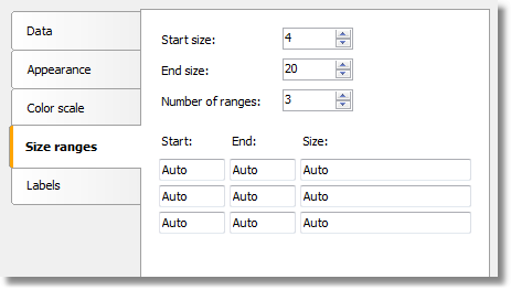 The size ranges have the following properties: min value, max value and size (in pixels). You can use as many ranges as you need. Set the number of ranges first and then set the properties for each range.