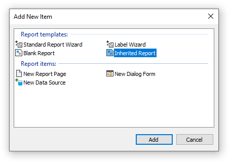 To create an inherited report, choose the "File|New..." menu item, then choose the "Inherited report" item in the window:
