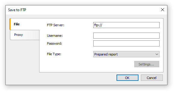 A prepared report can be saved to an FTP server from the FastReport.NET preview. The report can be exported to one of the supported formats before being saved to FTP.