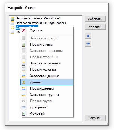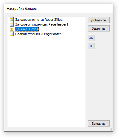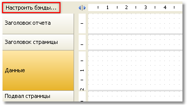 Чтобы добавить подчиненный бэнд "Данные", вызовите окно "Настройка бэндов". Это можно сделать, нажав кнопку "Настроить бэнды...", показанную на рисунке, или выбрав пункт меню "Отчет|Настроить бэнды...". В окне настройки отображается текущая структура бэндов: